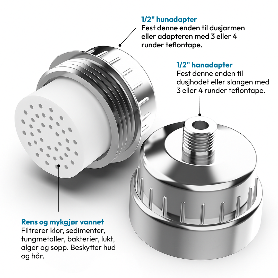 Det 15-trinns filtreringssystemet fjerner klor, tungmetaller og urenheter i vannet, samtidig som det tilfører strålen Vitamin C og E. Skru bare filteret på din eksisterende dusjarm – ingen verktøy, ingen rørlegger, ingen stress. Nyt mykere og renere vann allerede fra første skylling